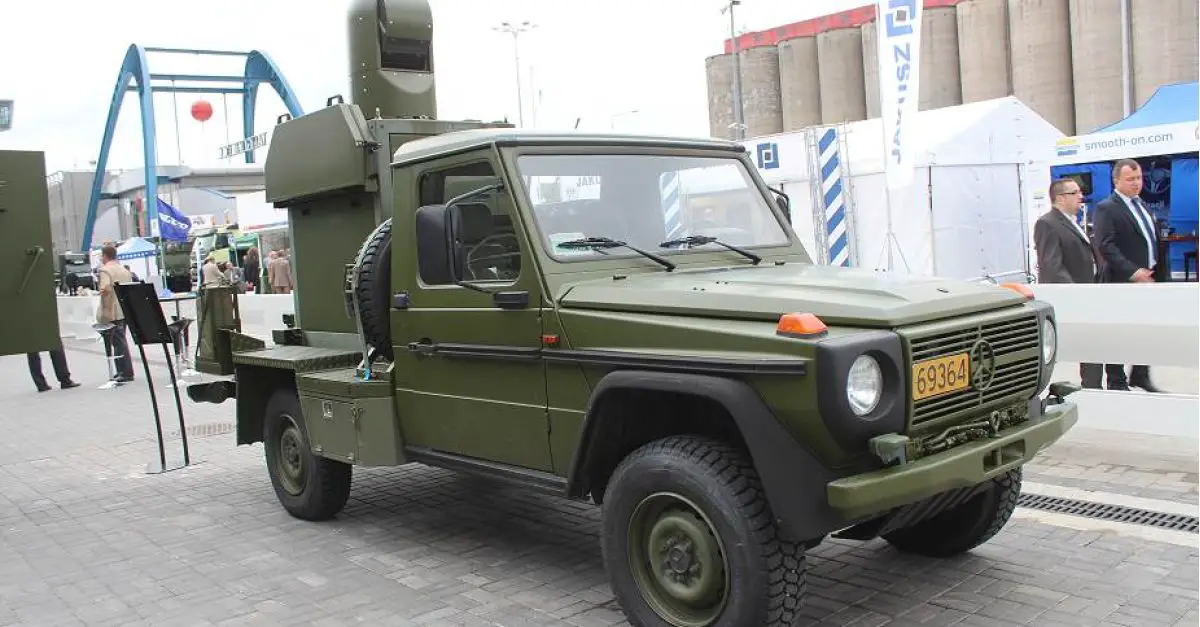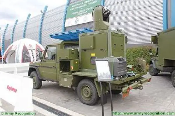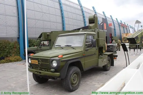 Each NASAMS (Norwegian Advanced Surface to Air Missile System) battery consists of 3 or 4 truck-mounted MSP500 electro-optical sensor for visual target identification and raid size assessment. The electro optical sensor is mounted at the rear of a G-Class Mercedes 4x4 light tactical vehicle.