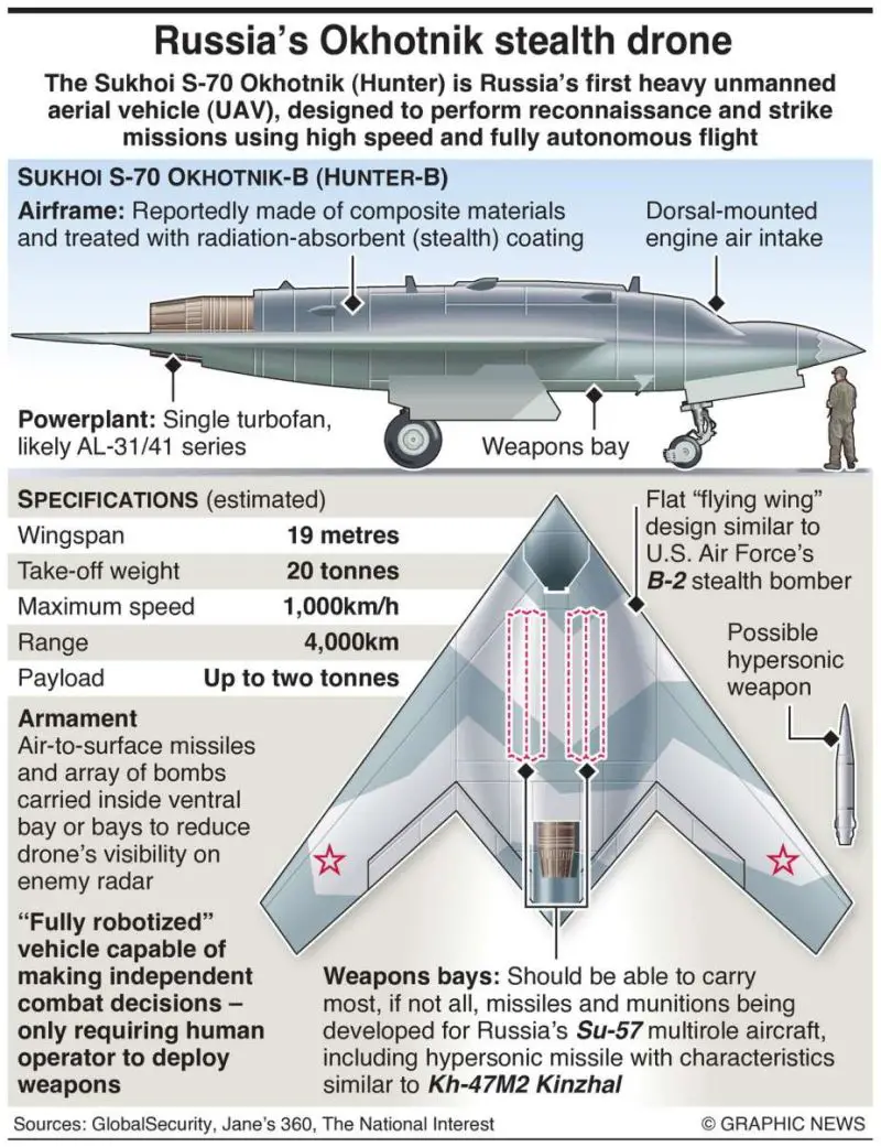 The S-70 Okhotnik-B, also known as "Hunter," is a Russian-made stealth unmanned combat aerial vehicle (UCAV) developed by Sukhoi under the Russian Ministry of Defense. Designed for reconnaissance, electronic warfare, and precision strikes, the Okhotnik-B is intended to operate both autonomously and in coordination with manned aircraft, such as the Su-57 fifth-generation fighter. Its development marks a significant advancement in Russia’s air combat capabilities, enhancing the operational flexibility of the Russian Air Force.