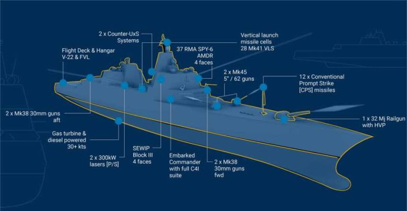 12-cell CPS, 128-cell Mk 41 VLS, 1 × 32 MJ Railgun, 2 × 5" guns, 2–4 lasers, RAM launchers, 30mm cannons, ODIN lasers, Counter-UxS systems