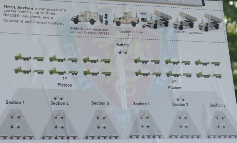 An NMESIS battery consists of two platoons, each comprising three Medium-Range Missile System Launcher (MMSL) sections. Each MMSL section includes a Leader Vehicle, up to three ROGUE-Fires missile launchers, and a Command and Control (C2) system. The C2 vehicle in the NMESIS system is based on the Joint Light Tactical Vehicle (JLTV) platform, ensuring compatibility with the mobility and protection features of the launcher and other system components. The C2 vehicle plays a vital role in coordinating missile launches and supporting the overall effectiveness of the NMESIS system by facilitating communication and synchronization among multiple units.