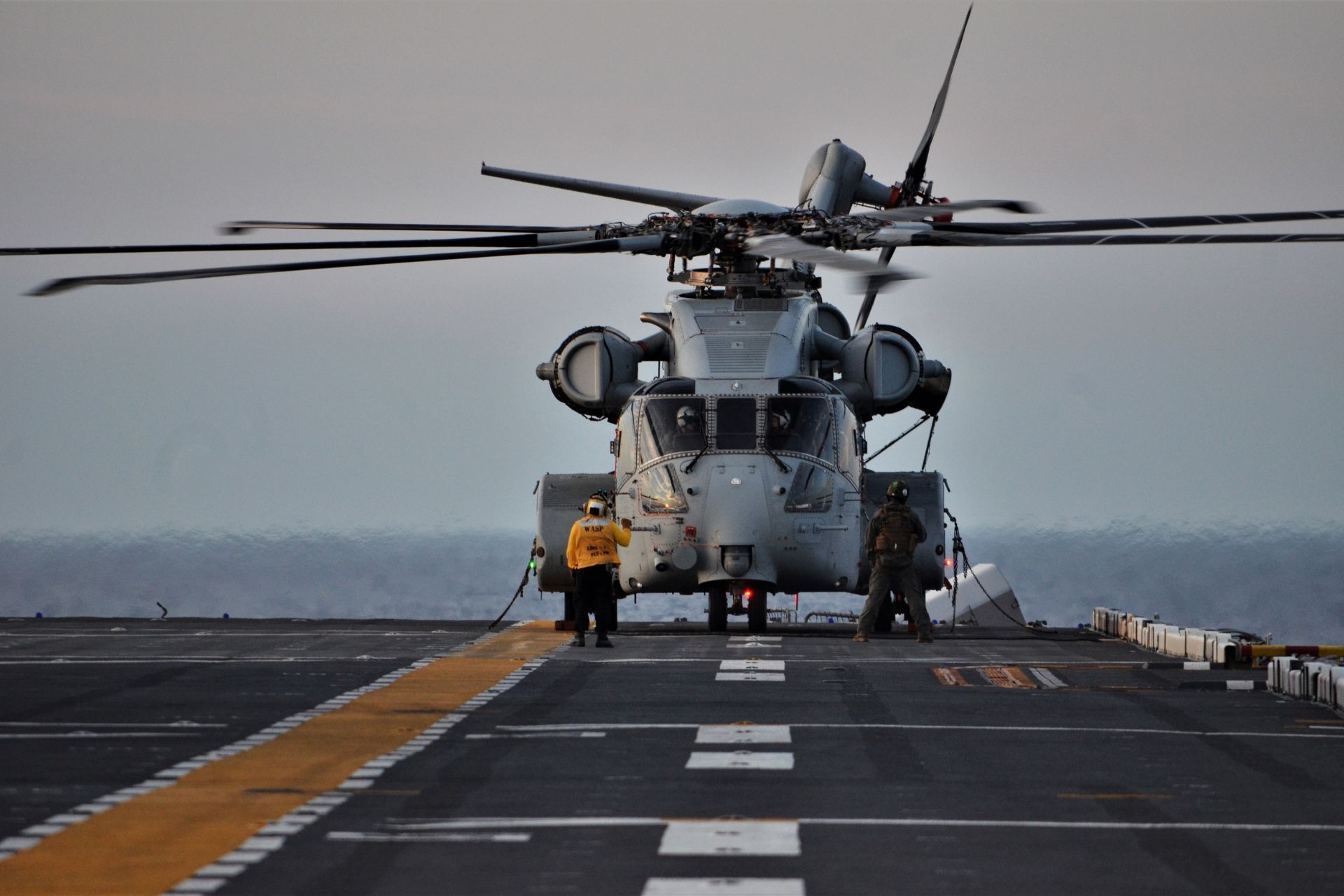 The CH-53K King Stallion prepares for take-off during sea trials in June 2020 on the USS Wasp (LHD-1) (Picture source: US DoD)