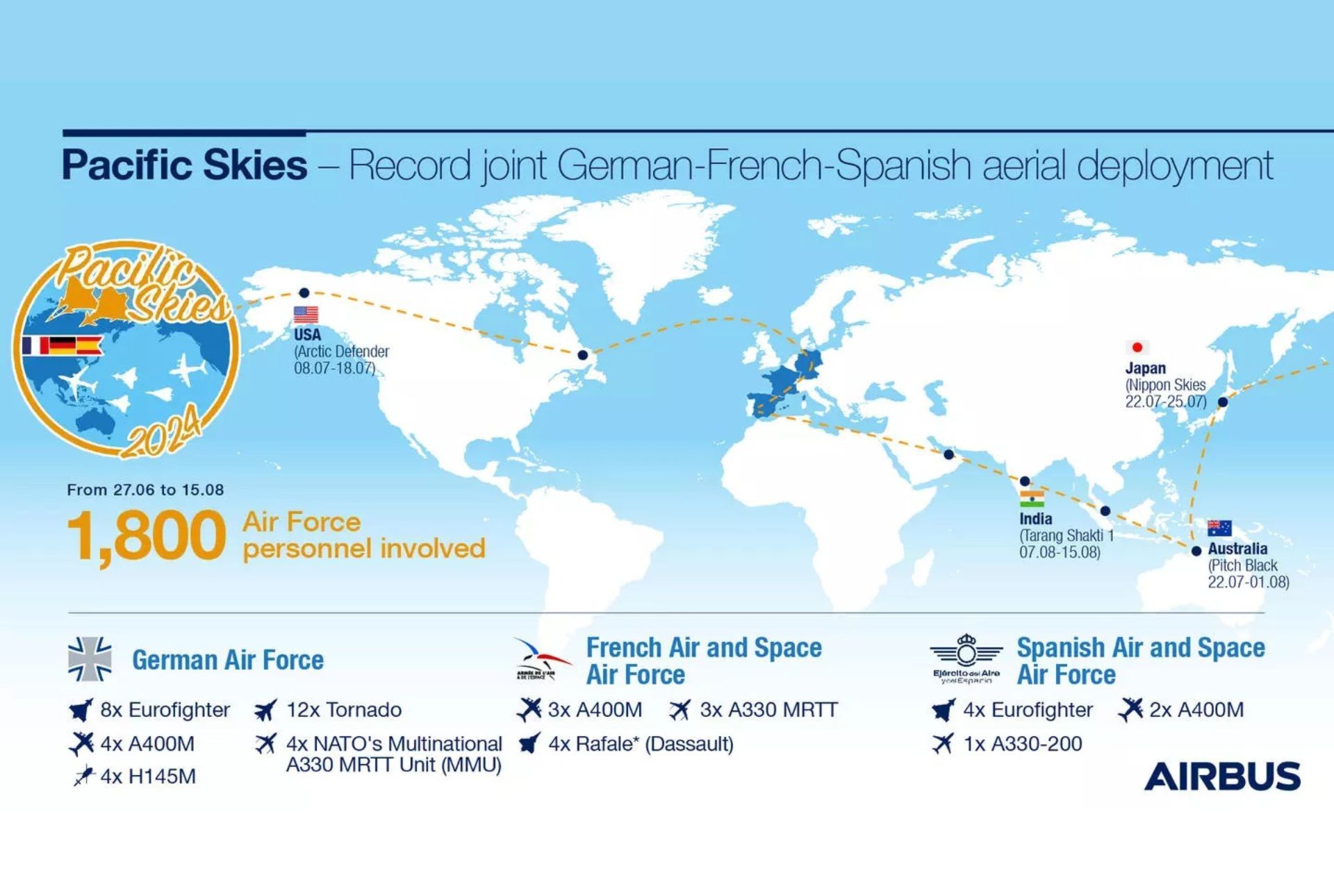 Pacific Skies 2024 features 40 Airbus military aircraft and over 1,800 military personnel who will traverse icy, desert, and tropical environments during the 58,000-kilometer journey from June 27 to August 15. The deployment includes major exercises such as Arctic Defender in Alaska, Nippon Skies in Japan, Pitch Black in Australia, and Tarang Shakti 1 in India. These exercises aim to bolster the operational capability of the participating air forces and strengthen military ties with countries in the Indo-Pacific region.