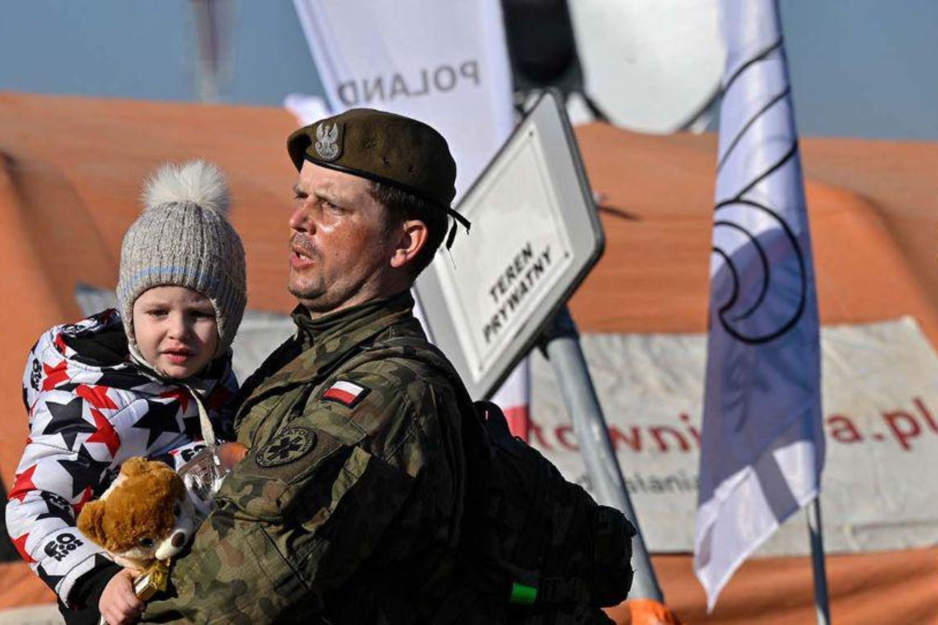 A Polish soldier carries a child while assisting a Ukrainian family after they crossed the border into Poland at Medyka on March 14, 2022. (Picture source : Louisa GOULIAMAKI)