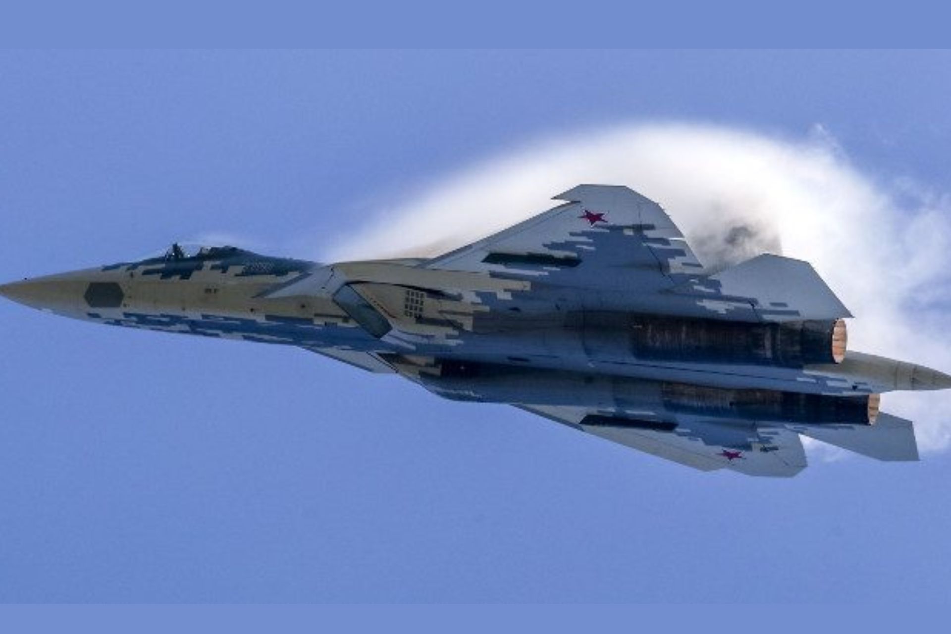 Su-57 accelerates and prepares to pass MACH 1, with the air beginning to form a cone around the aircraft during its test phases ( Picture source: Russia Aerospace forces)