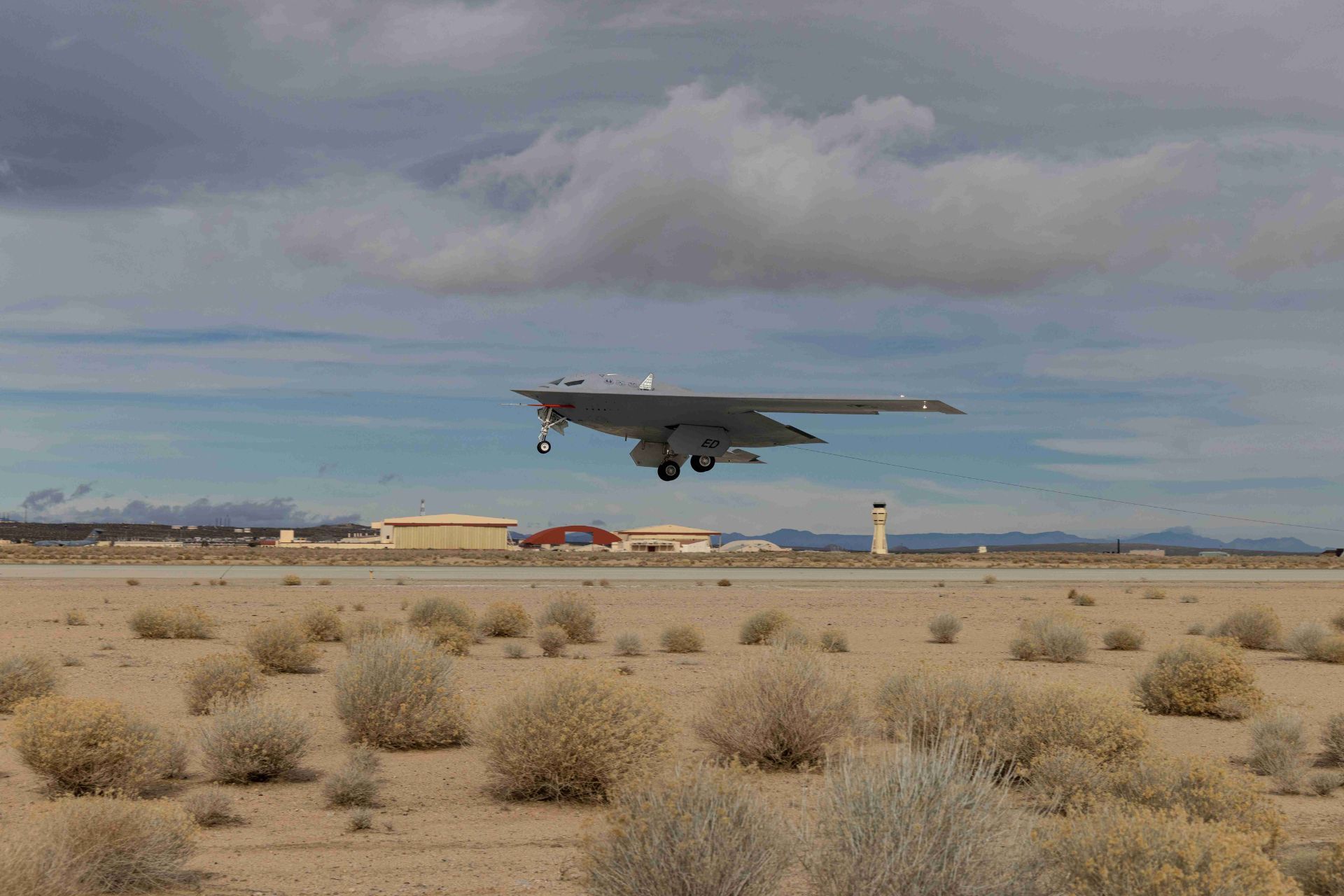 A B-21 Raider conducts flight tests, which include ground testing, taxiing, and flying operations, at Edwards Air Force Base, California, where it continues to make progress toward becoming the backbone of the U.S. Air Force bomber fleet (Picture source: US DoD)