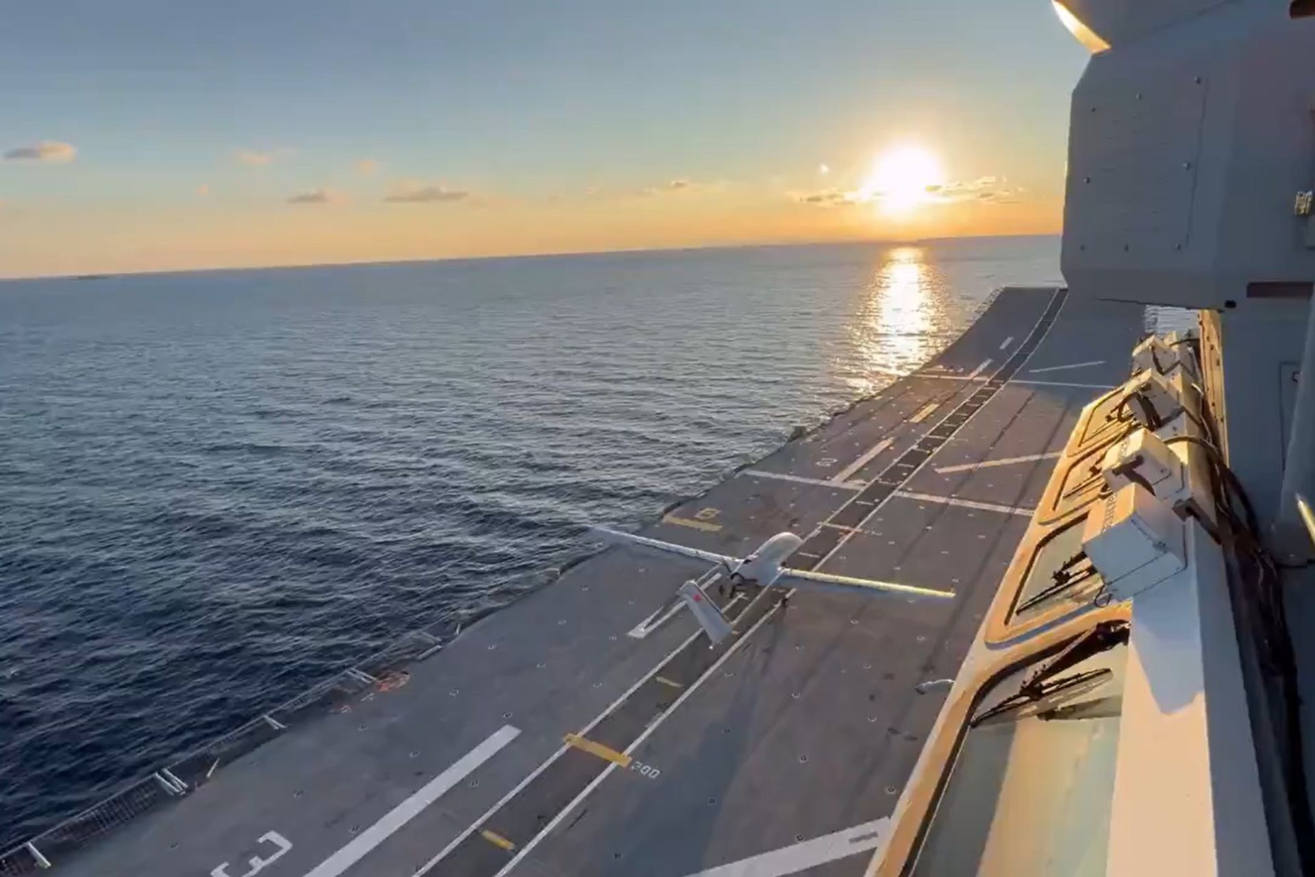 Screenshot from the video showing the Turkish Bayraktar TB3 UCAV's first successful takeoff and landing on the TCG Anadolu. (Picture source: X Channel @Clash Report)