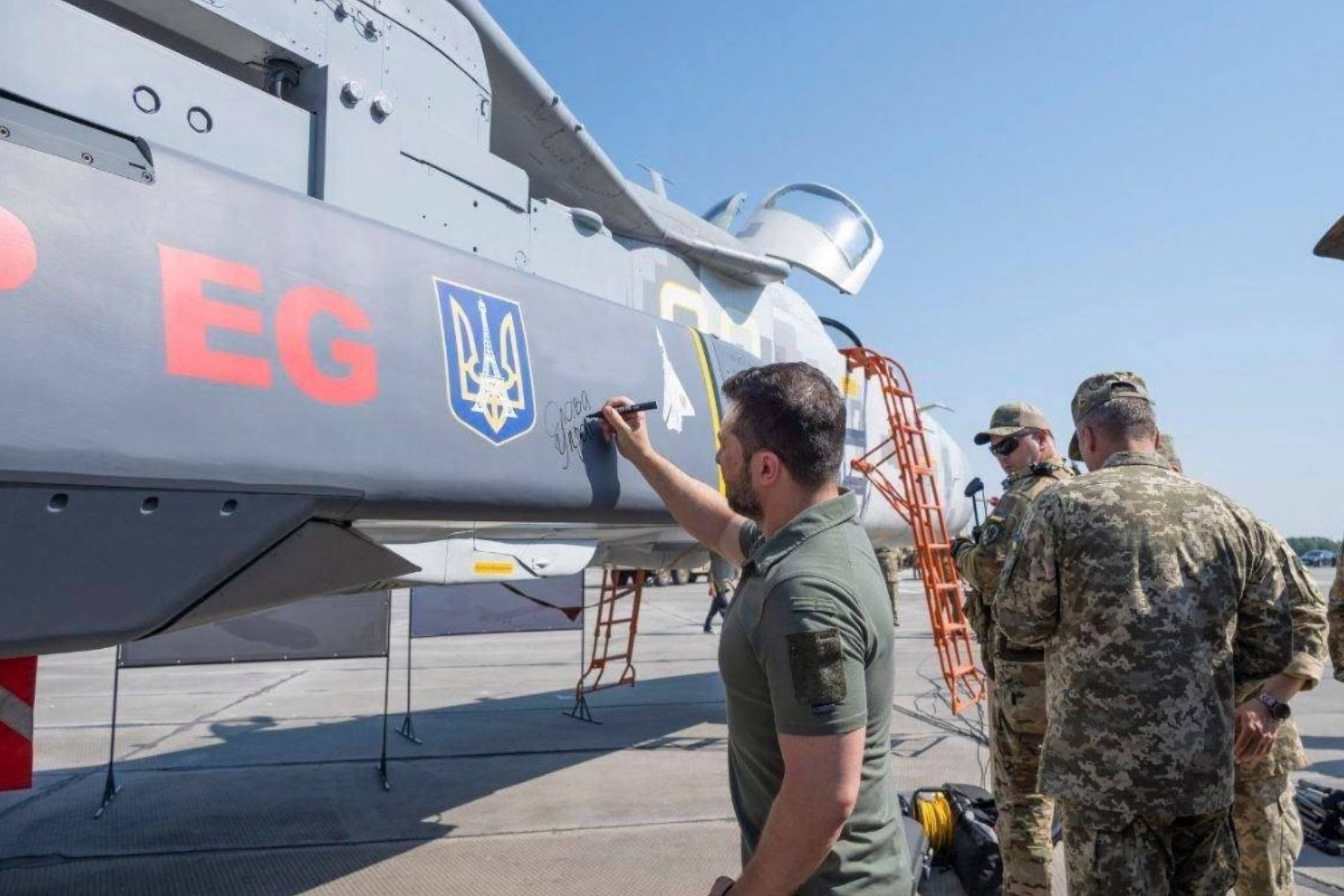 President Zelensky writing ‘Glory to Ukraine’ on a SCALP-EG missile carried by a Ukrainian Air Force Su-24 ‘Fencer’ strike aircraft. (Picture source: Ukrainian MoD)