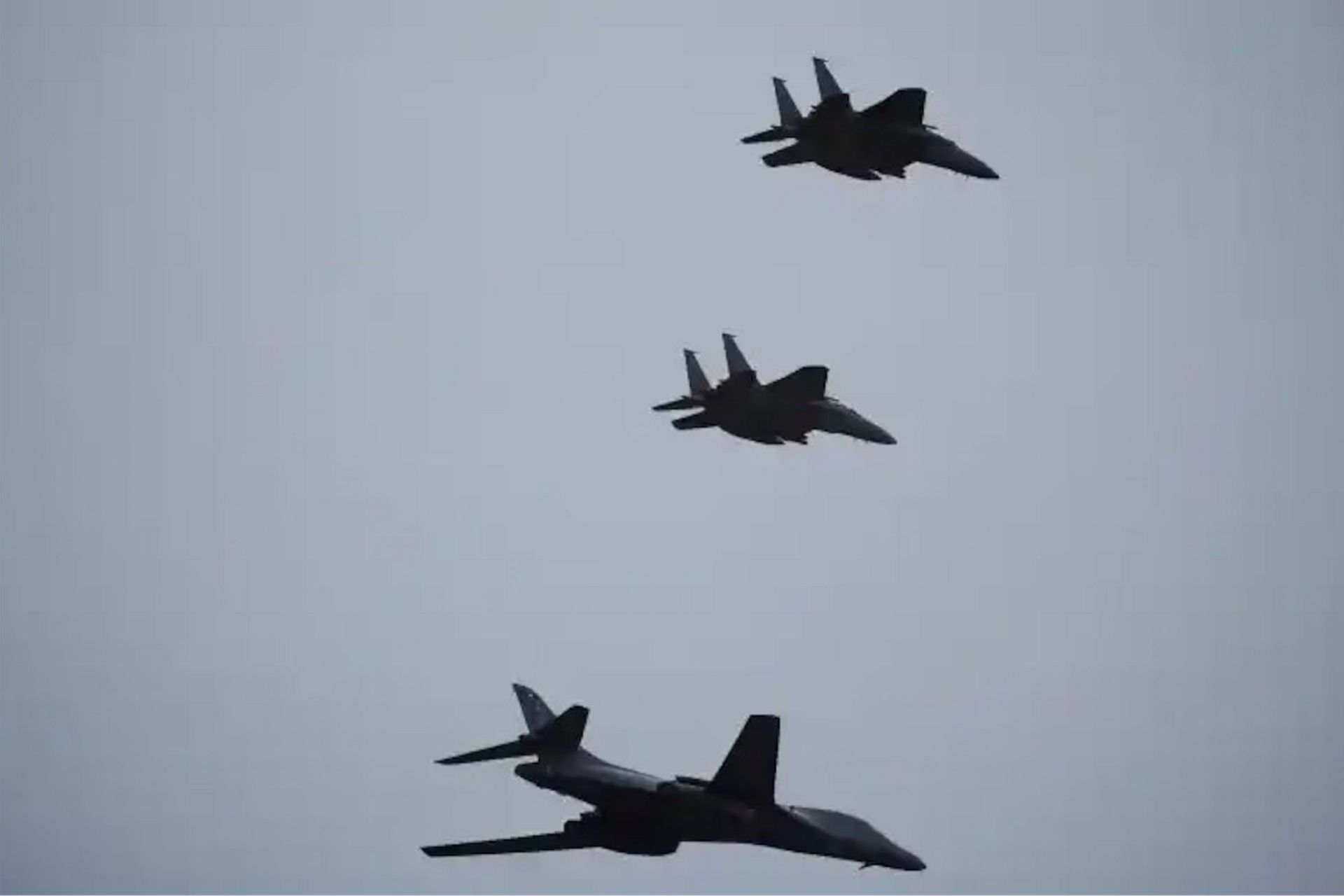 A U.S. Air Force B1 Bomber flies alongside South Korean Air Force F-15K fighter jets during a ceremony in Seongnam, South Korea. (Picture source: US DoD)