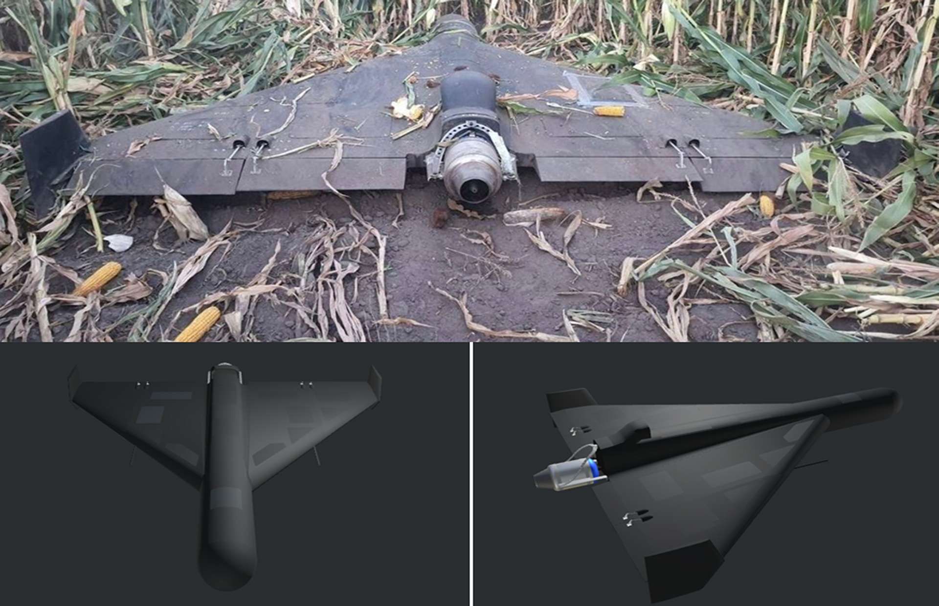The seized airframe shows a compact delta wing planform built from composite skins over simple internal structure. This geometry is familiar by now, but the powerplant is not the small gasoline engine of the earlier Geran-2. At the tail sits a compact turbojet mounted on a short pylon with an intake duct blended into the fuselage. A jet package gives more speed and a crisper throttle response, which is useful when the operator needs to keep air defenses guessing. The intake, rear nozzle hardware and mounting frame are all visible on photos released by Ukrainian units, and they match what wreckage collectors along the front have been seeing for months.