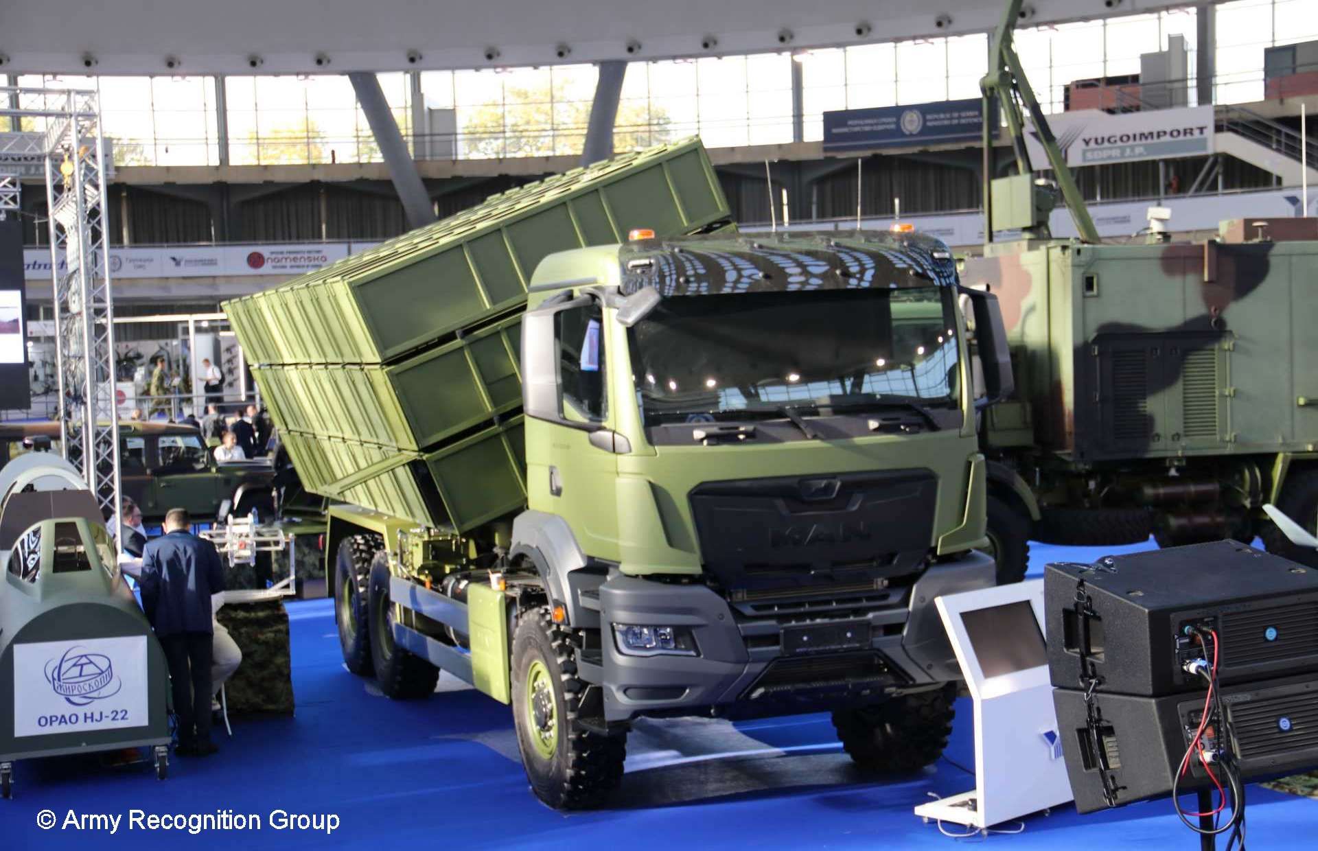 Serbia showcased the Raven concept at the Partner 2025 defense expo in Belgrade: a MAN 6x6 truck-mounted launcher carrying 27 canisterized loitering munitions set at ~30° for rapid ripple fire and high-volume salvos intended to overwhelm short-range air defenses.