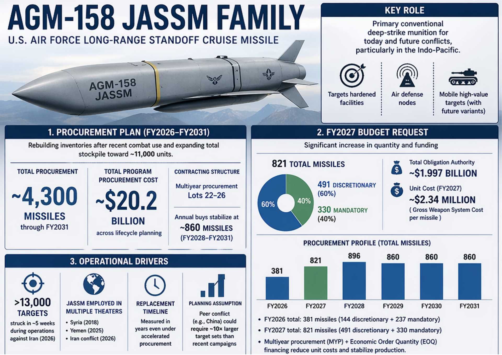 On April 23, 2026, the U.S. Air Force released a new procurement plan to acquire nearly 4,300 AGM-158 Joint Air-to-Surface Standoff Missiles (JASSMs) through fiscal year 2031, with the stated objective of rebuilding inventories after recent operations against Iran and expanding the total stockpile to about 11,000 units. The program is structured under a multiyear procurement framework covering Lots 22 to 26, with annual quantities rising sharply in the near term before stabilizing. Total program procurement is projected at about $20.2 billion over the planning horizon, including both baseline funding and advance procurement elements.