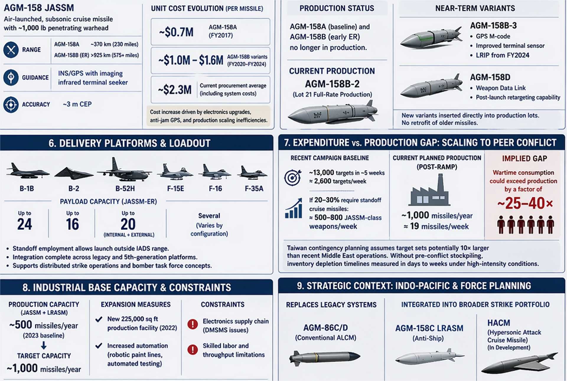The AGM-158 family of missiles, which was used in Syria in April 2018 and in Yemen during 2025, was also extensively used in the 2026 Iran conflict, indicating repeated reliance on long-range standoff munitions. If 20 to 30 percent of targets in such campaigns require cruise missiles, weekly demand must have ranged between 500 and 800 JASSM-type missiles. Current planned production, even after expansion, is about 1,000 missiles per year, or roughly 19 JASSMs per week, potentially creating a mismatch between consumption and replenishment rates. This implies that sustained high-intensity operations could exhaust available inventories within a short timeframe, as replacement timelines for expended missiles extend over multiple fiscal years due to production constraints.
