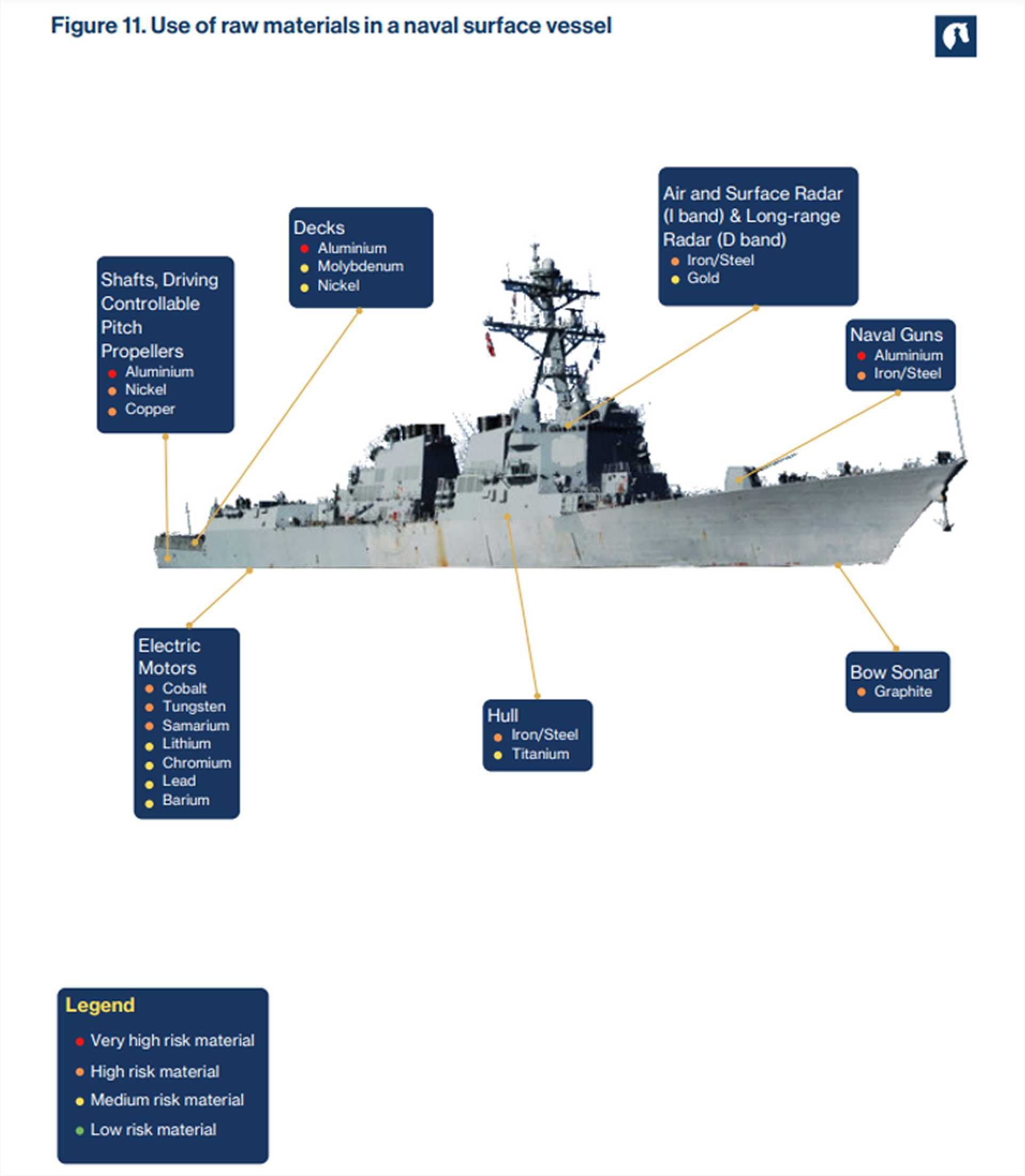Warships depend on a narrower but critical set of materials. Aluminum is used for decks, superstructures, and propulsion shafts, while titanium and iron/steel form the hulls and structural reinforcements for their corrosion resistance and strength. Copper supports propulsion systems and onboard electrical components. Lithium and silver are utilized in battery technologies for submarines and torpedoes, enabling energy storage and propulsion. Nickel and cobalt are integral to electronic systems, navigation radars, and sonar, providing reliability in marine environments. These materials collectively ensure the vessels' operational effectiveness in various naval scenarios.