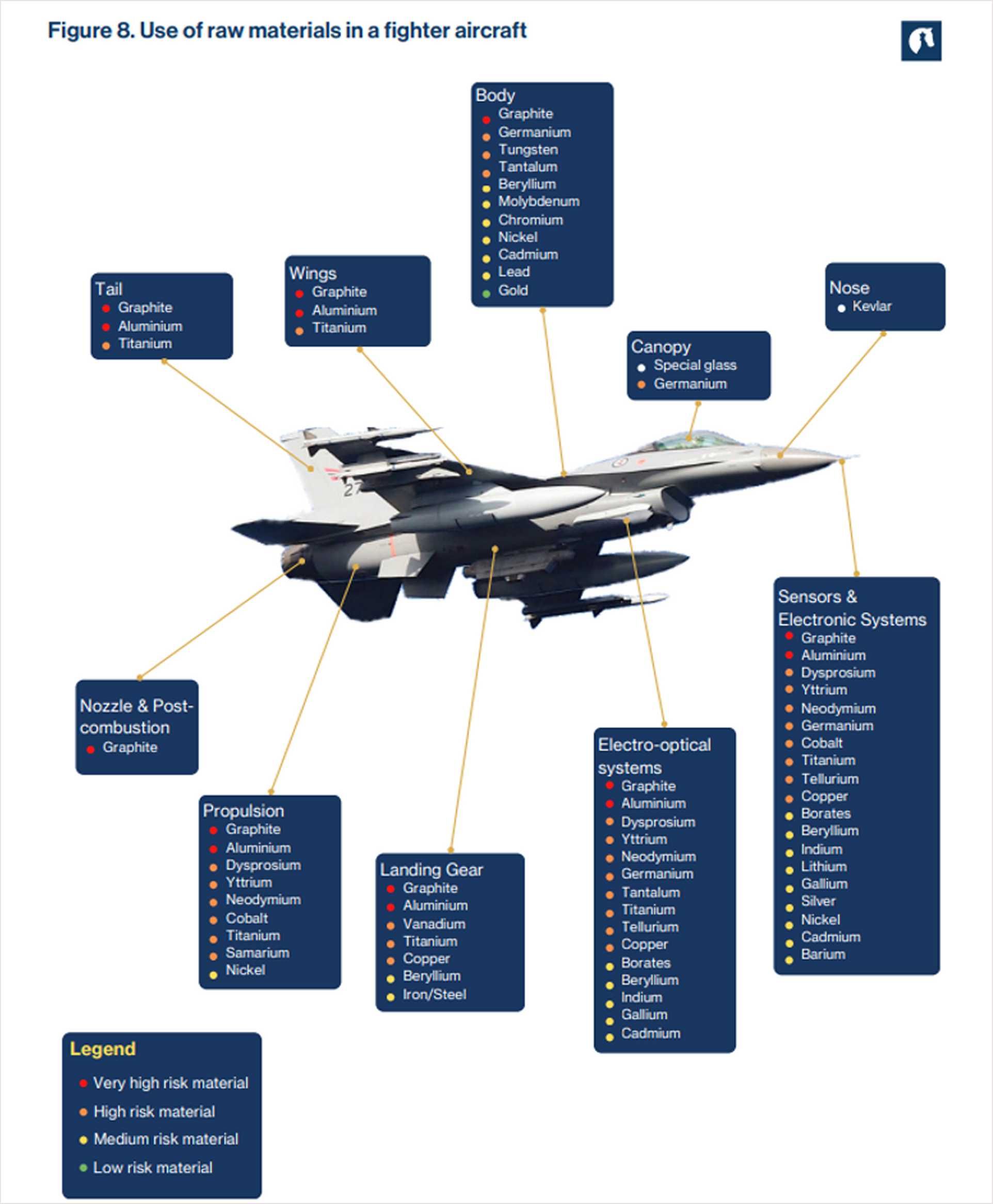 Fighter aircraft, like the American F-16 and F-35, require a broad array of CRMs due to their high-performance demands. Aluminum and graphite are key for airframes, including the body, wings, and tail, due to their lightweight and strength. Titanium is widely used in propulsion systems, including turbines and nozzles, for its heat resistance and strength. Copper is applied in electro-optical and control systems, while nickel is used in airframes and propulsion systems for heat resistance. Rare earth elements such as neodymium and dysprosium enable advanced avionics and control systems. Borates and gallium are crucial for radar, sensors, and electronic warfare systems, highlighting the reliance on materials with specific electromagnetic properties.