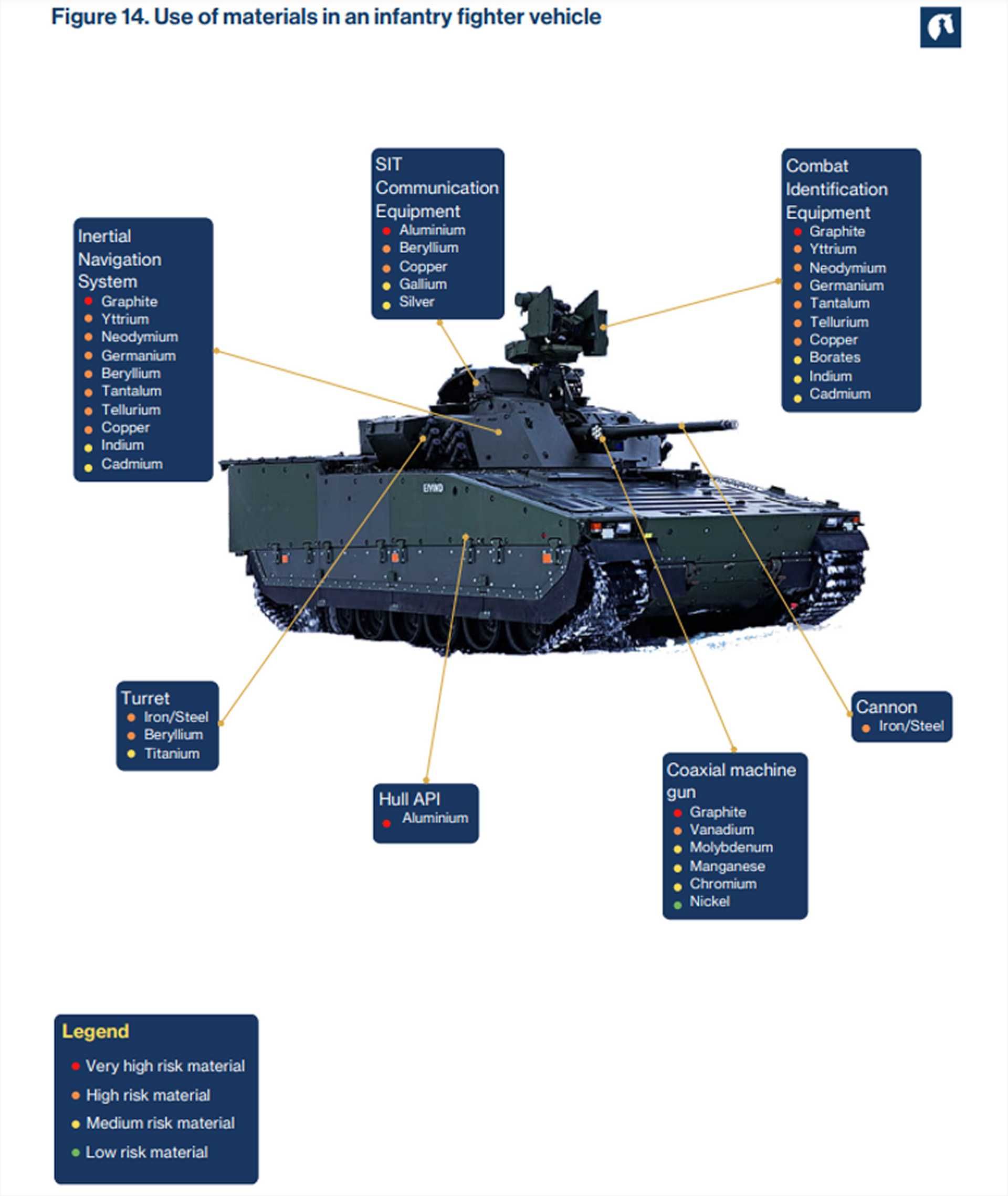 For example, critical raw materials (CRMs) are essential to producing tanks and infantry fighting vehicles, such as the Swedish-made CV90. Infantry fighting vehicles heavily rely on aluminum for structural components and graphite for electronic systems, ensuring functionality under diverse operational conditions. Beryllium is used in connectors and onboard electronics due to its lightweight and conductive properties. Titanium and iron/steel are employed for armor and propulsion systems, with the latter providing durability and structural strength. Copper supports communication systems, while tungsten enhances precision-guided mechanisms and armament effectiveness.