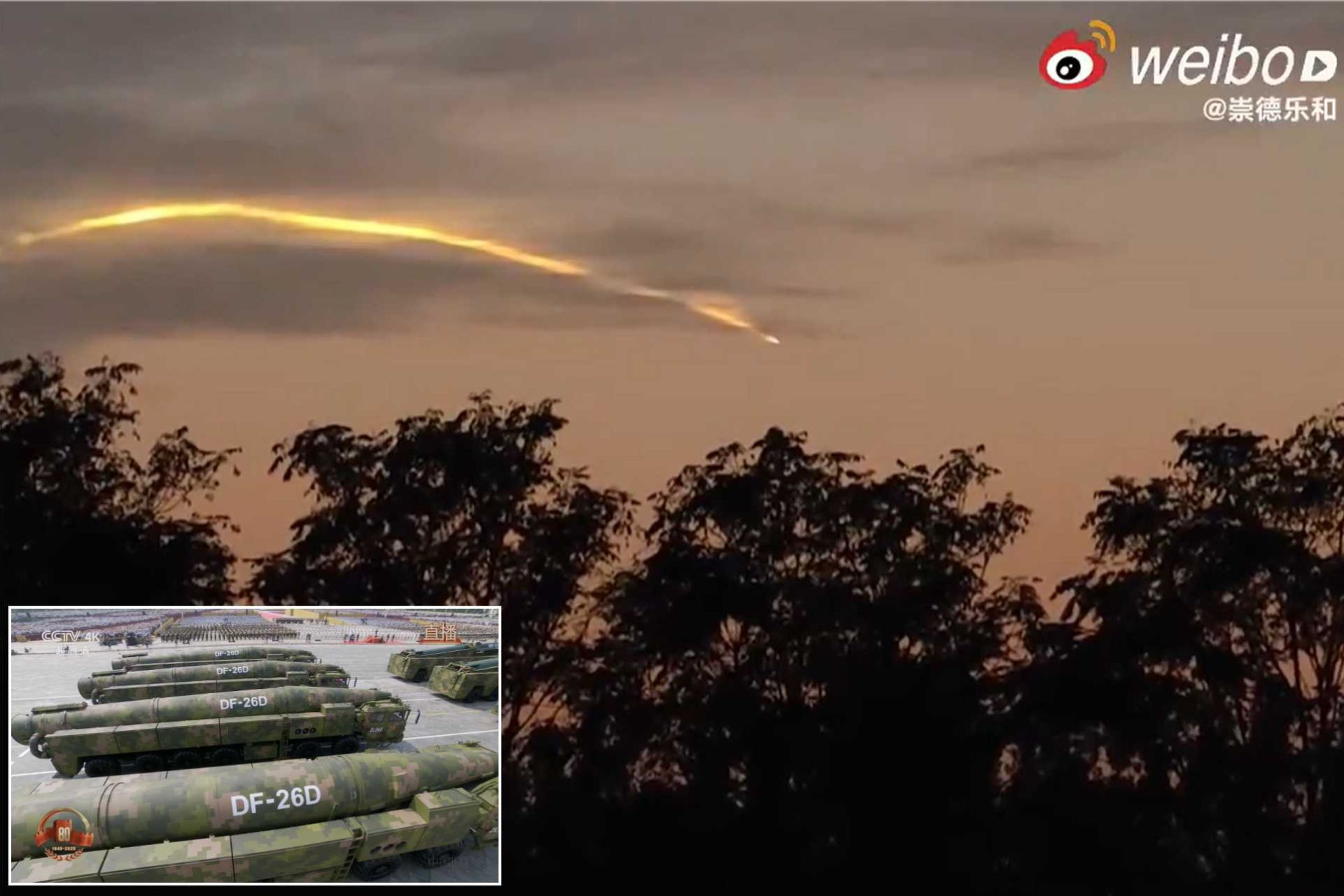 Image released on Chinese social networks in September 2025 reportedly shows the test launch of the new DF-26D intermediate-range missile, a variant believed to carry a hypersonic glide warhead and intended to target U.S. bases and carrier strike groups in the Pacific (Picture source: China Social Network)