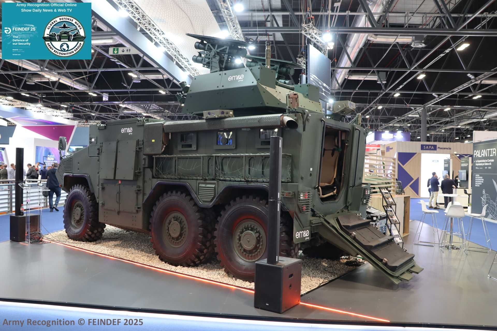 At the 2025 edition of Spain’s international defense and security exhibition FEINDEF, the Spanish company EM&E Group, also known as Escribano Mechanical & Engineering, officially presented its new 6x6 armored vehicle platform, the Ferox. Introduced on the second day of the event, the vehicle was showcased before a delegation of government officials, industry leaders, and technological stakeholders. The model on display was fully integrated with the Guardian 2.0 Pro remotely operated weapon station, also developed by Escribano.