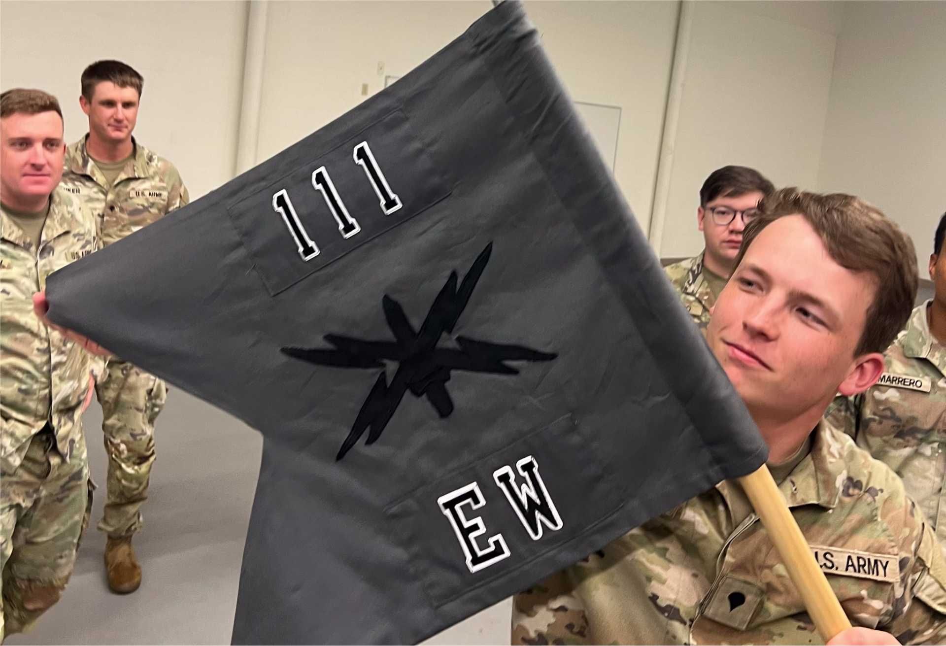 The official unit flag of the newly activated 111th Electromagnetic Warfare Company is displayed during a formation ceremony, symbolizing the U.S. Army's first dedicated National Guard unit specializing in electromagnetic spectrum dominance. (Picture source: U.S. DoD)