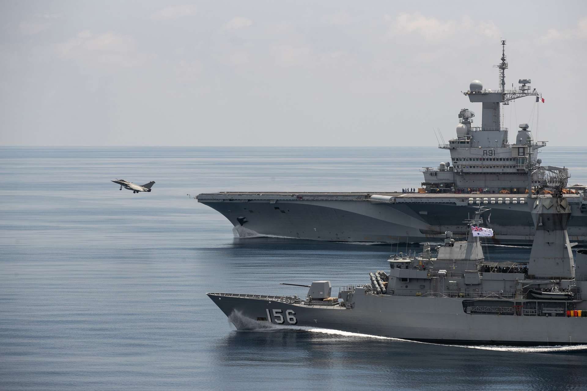Australian Navy HMAS Toowoomba supports French Ship Charles De Gaulle as a Rafale F3 aircraft launches during the French-led La Perouse exercise (Picture source: LSIS Tara Byrne)
