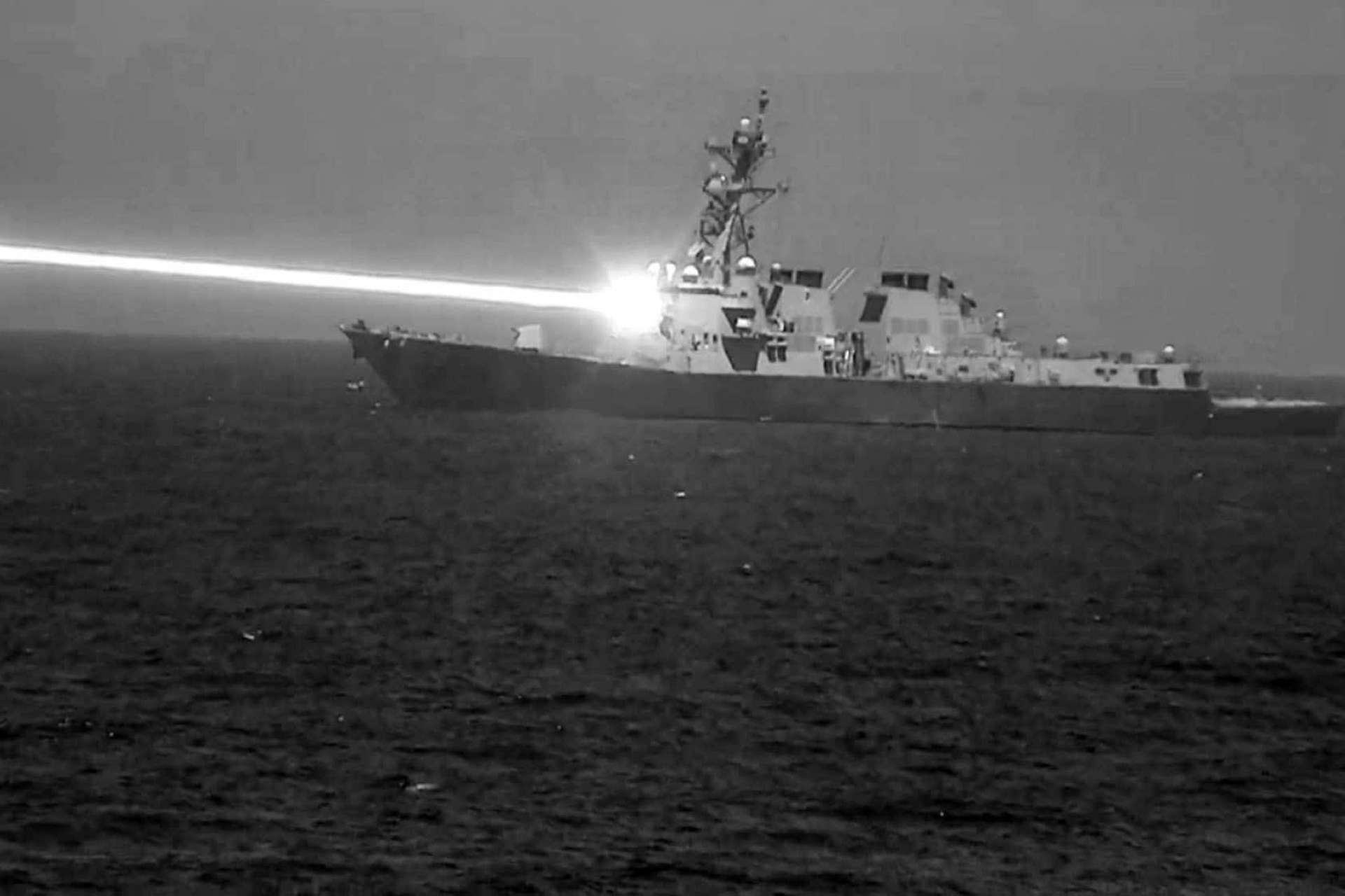 The U.S. Navy’s HELIOS laser weapon system is seen mounted on a destroyer, firing a concentrated energy beam across the sea to intercept aerial or surface threats (U.S. Navy)