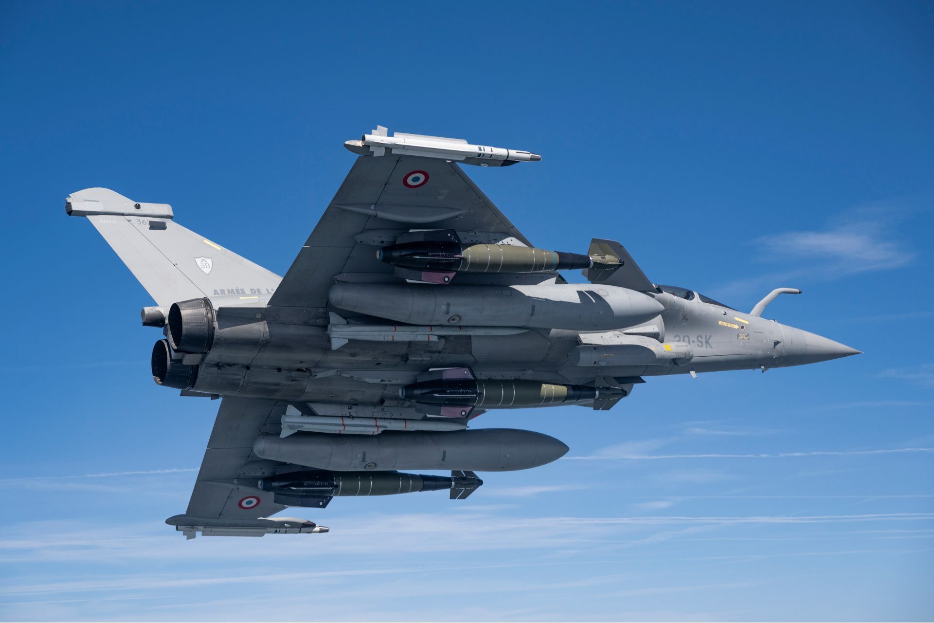 The Rafale combines the RBE2 AESA radar, the OSF forward sector optronics, the Spectra electronic warfare suite, a helmet-mounted sight, and a weapons set covering air superiority, strike, and anti-ship missions. (Picture source: French MoD)