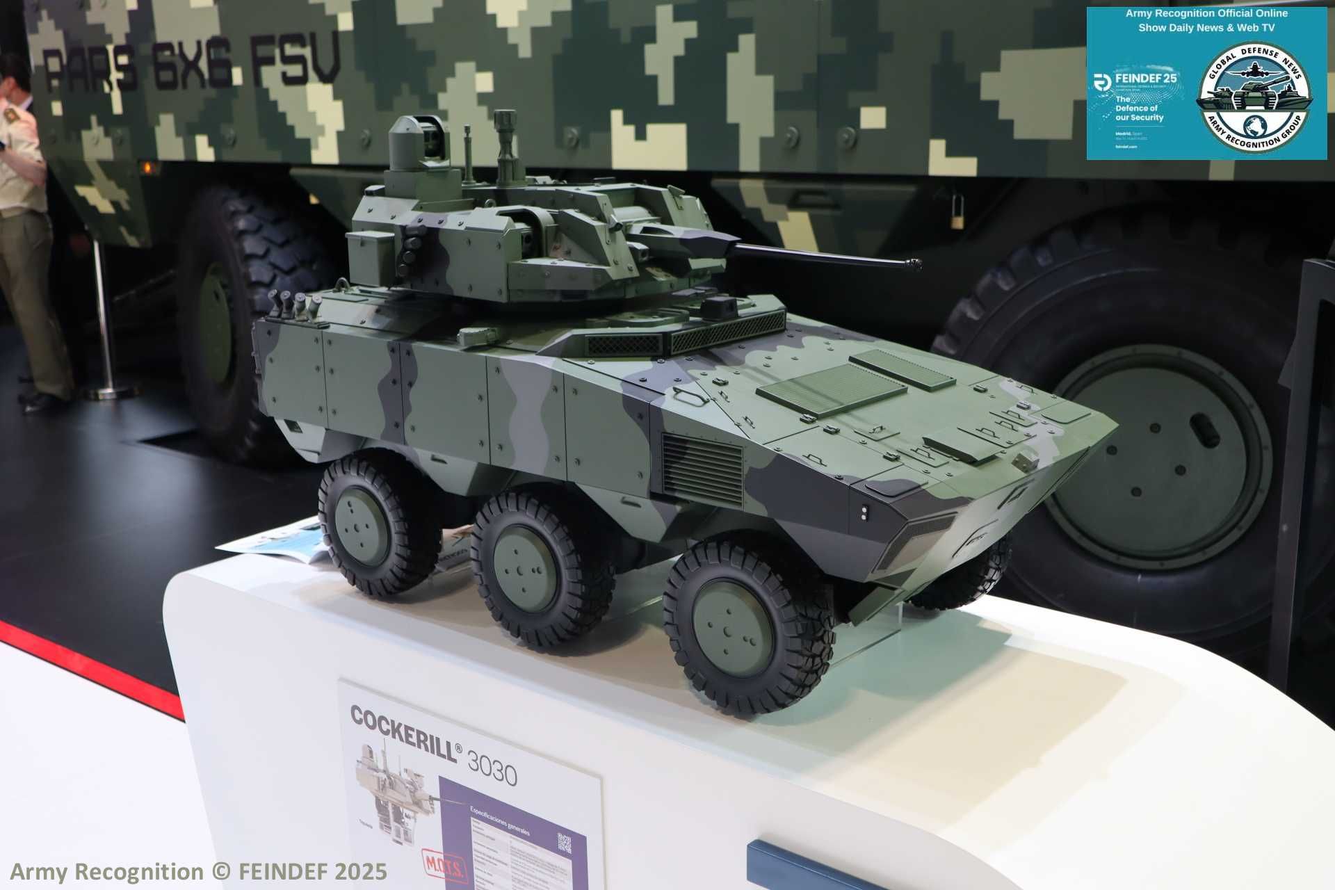 FNSS is participating for the first time in the International Defence and Security Exhibition of Spain (FEINDEF), held from 12 to 14 May 2025 in Madrid. During the event, FNSS presents the Pars III 6x6 Wheeled Armoured Vehicle as well as the conceptual design of the Pars Alpha 6x6, a fire support and reconnaissance vehicle developed for the Turkish Land Forces. The conceptual model is exhibited with a Cockerill Series 3000 two-man 30mm turret, specifically the Cockerill 3030, produced by John Cockerill Defense.