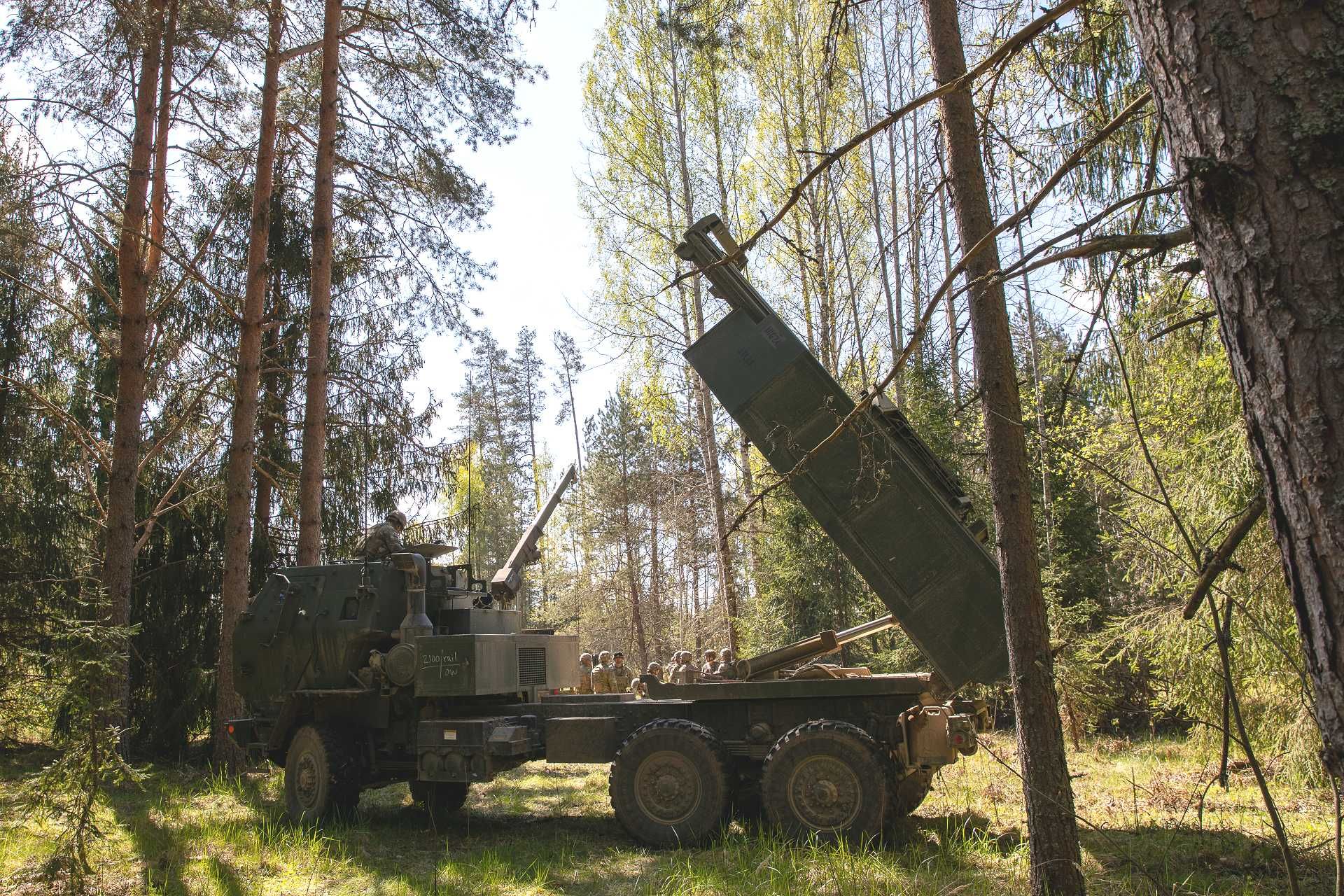 A U.S. Army M142 HIMARS (High Mobility Artillery Rocket System) from Able Battery, 3rd Battalion, 321st Field Artillery Regiment, assigned to Task Force Voit, conducts a live-fire mission during Exercise Hedgehog near Võru, Estonia, on May 13, 2025. (Picture source: U.S. DoD)