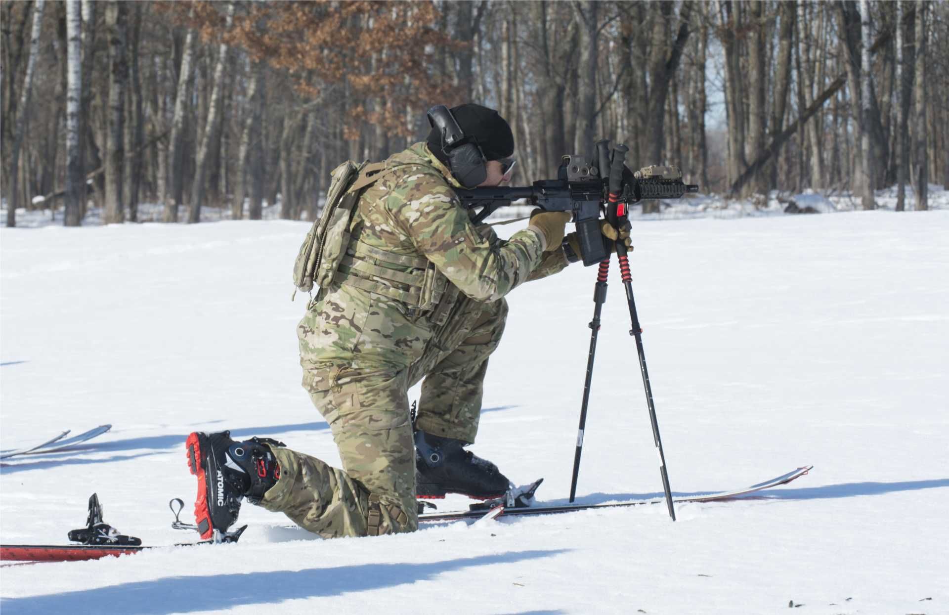 A U.S. Navy Explosive Ordnance Disposal (EOD) Technician, assigned to EOD Mobile Unit Two, fires an M-4 rifle while skiing in Arctic mobility training. (Picture source: U.S. DoD)
