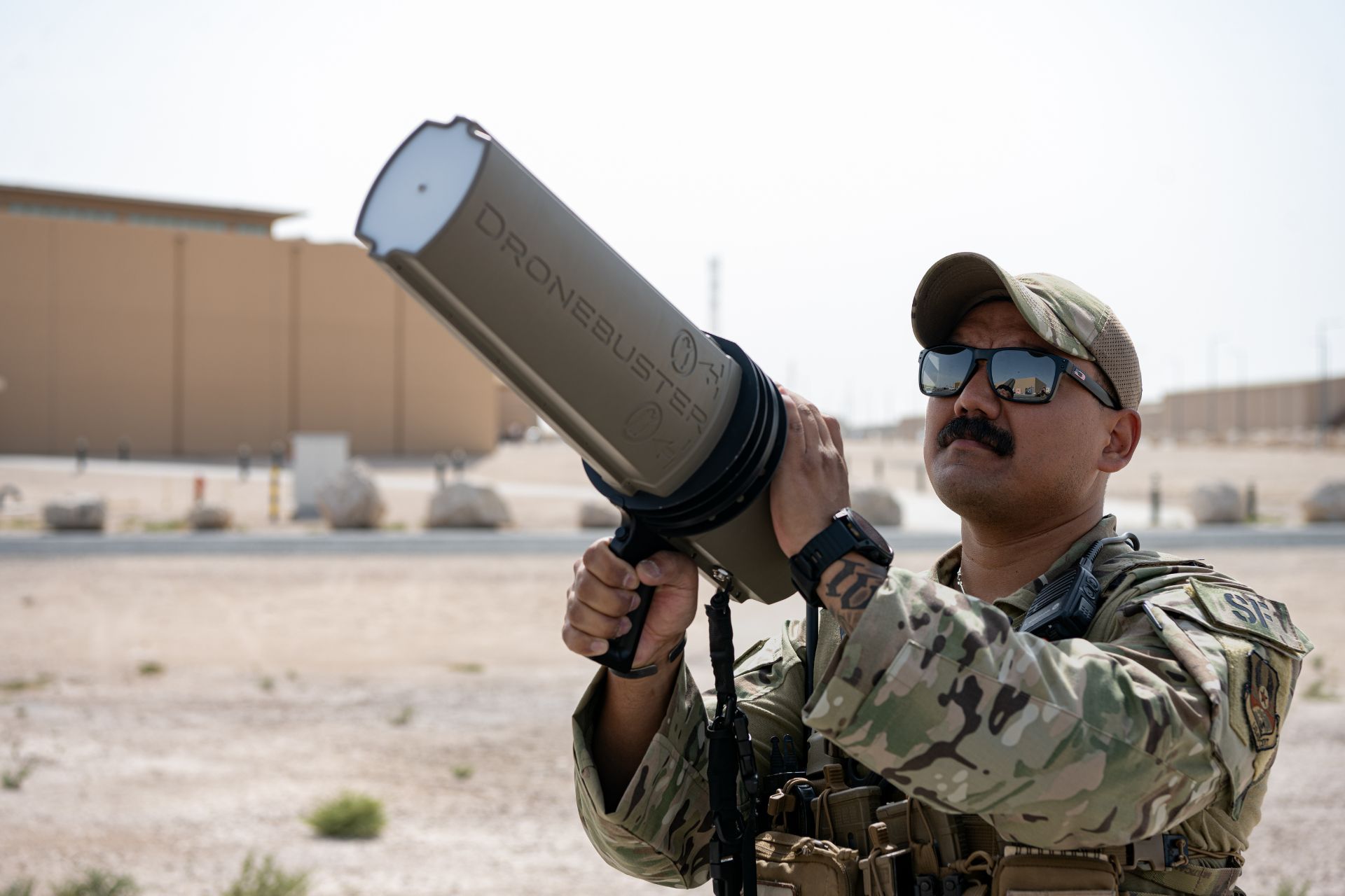 A U.S. Air Force Security Forces defender uses a Dronebuster counter small unmanned aerial system device during C-UAS training in the U.S. Central Command area of responsibility on April 11, 2024. (Picture source: US DoD )