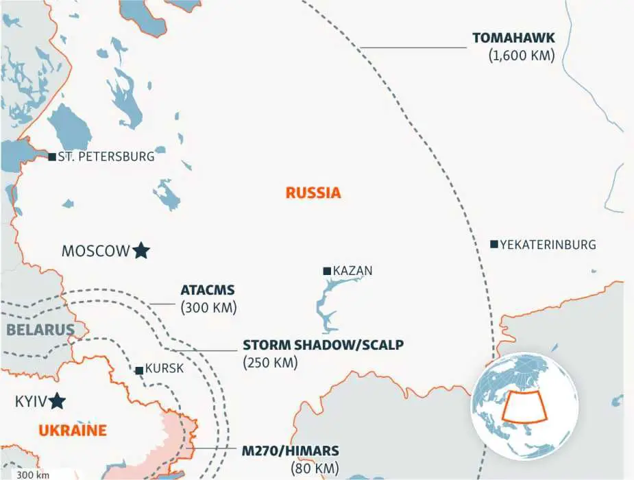 Comparison of current U.S.-supplied weapon ranges to Ukraine, including HIMARS, ATACMS, and Storm Shadow, versus the extended reach of the Tomahawk cruise missile. With a range of up to 1,600 kilometers, the Tomahawk dramatically expands Ukraine’s ability to strike deep into Russian territory beyond existing long-range systems.