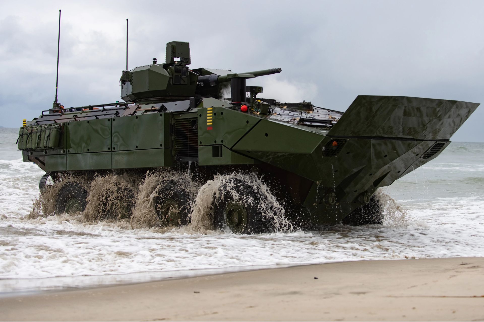 The ACV-30, the gun-armed variant reshaping the ACV family’s tactical employment, combines an 8×8 amphibious chassis with Kongsberg’s remotely operated Medium Caliber Turret (MCT-30), integrating a 30 mm Mk 44 Stretch Bushmaster dual-feed cannon and a coaxial machine gun (Picture source: Kongsberg)