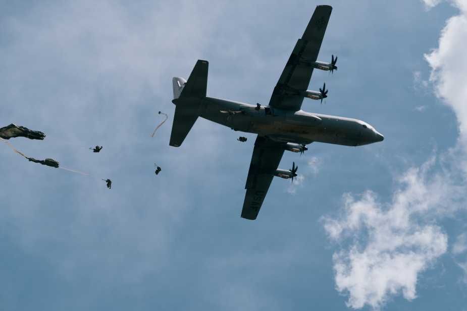 Paratroopers assigned to the 82nd Airborne Division conduct a mass tactical airborne operation from a U.S. Air Force transport aircraft during training at Fort Bragg, North Carolina, June 10, 2025, demonstrating the unit’s rapid-entry capability. (Picture source: U.S. Department of War)