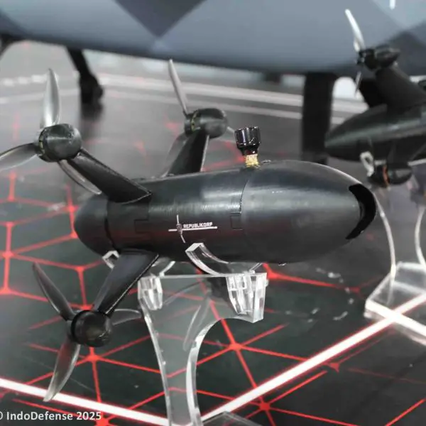 During the IndoDefense 2025 defense exhibition, the Indonesian company Republik Defence presented a compact multirotor loitering munition named Bra...