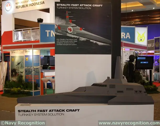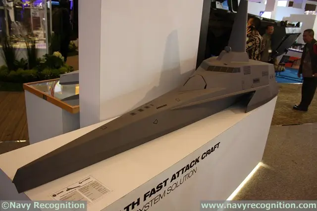 ![]() The Stealth Fast Attack Craft scale model on display on the joint Saab/PT Lundin stand at Indodefence 2014. |