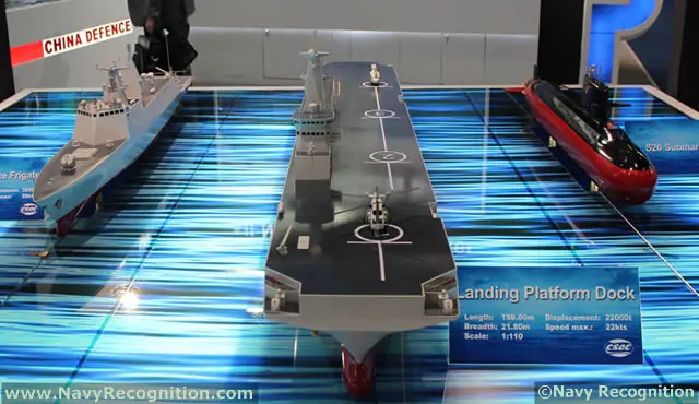 Shipbuilding, a wholly owned subsidiary of CSSC. LPD/LHD design for export Navy Recognition saw Chinese LHD designs in the past while we were covering international defense shows. At AAD 2014 last year in South Africa, the CSOC stand featured an LHD design called "LPD". And during IDEX 2013 in the UAE, we interview a representative about the LHD/LPD basic specifications. Read our article at this link to learn more about the specifications of the vessel. |