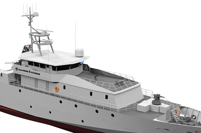 during poor sea conditions. For the design and PLG definition studies, Socarenam worked with MAURIC Ship Design specializing in naval architecture and engineering with offices established in Nantes and Marseille. Hulls and superstructures will be constructed by the shipyard Socarenam St. Malo, while fitting out will be made in the Boulogne-sur-Mer. CNN MCO company, established in Guipavas (Britanny), will ensure the work of operational maintenance of the two patrol boats during their first six years of service. Delivery of PLGs are expected by the end of 2016 for the first unit and in the summer 2017 for the second. |