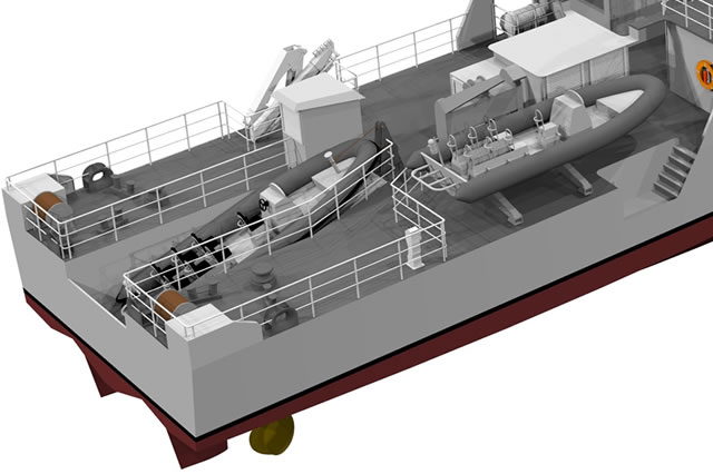 ![]() A ramp at the stern allows for quick launch and recovery of RHIBs while underway Picture: Bureau MAURIC & SOCARENAM |