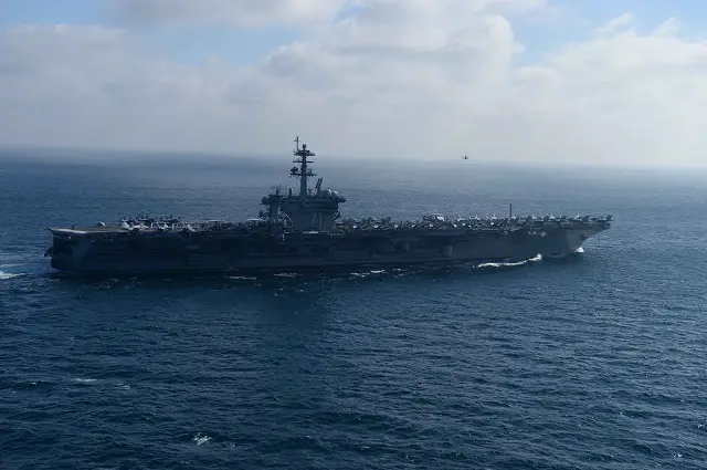 | ATLANTIC OCEAN (Jan. 16, 2015) The aircraft carrier USS Theodore Roosevelt (CVN 71) participates in a strait transit exercise. Theodore Roosevelt is underway participating in a composite training unit exercise (COMPTUEX), which tests the Theodore Roosevelt Carrier Strike Group's ability to effectively react to real-world scenarios and perform as an integrated unit. (U.S. Navy photo by Mass Communication Specialist 3rd Class Kris R. Lindstrom/Released) |