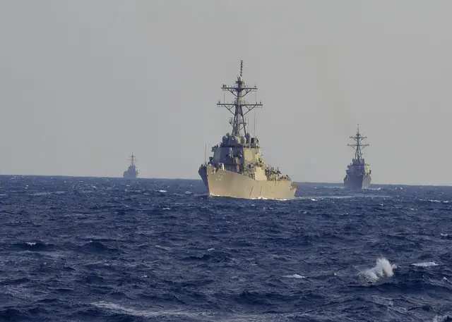 | ATLANTIC OCEAN (Jan. 22, 2015) The guided-missile destroyers USS Laboon (DDG 58), USS McFaul (DDG 74), and USS Farragut (DDG 99) conduct a strait transit exercise with the Arleigh Burke-class guided-missile destroyer USS Winston S. Churchill (DDG 81). Churchill is underway conducting a composite training unit exercise with the Theodore Roosevelt Carrier Strike Group in preparation for an upcoming deployment. (U.S. Navy photo by Senior Chief Culinary Specialist Rodney Davidson/Released) |