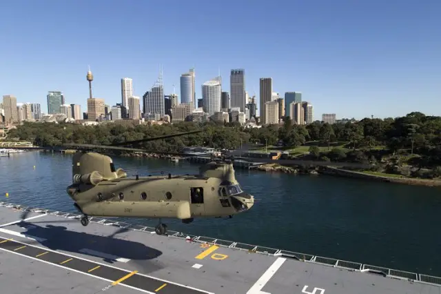 ![]() A Chinook CH-47F aircraft from the 5th Aviation Regiment in Townsville landing on HMAS Canberra while the ship is alongside in her home port of Sydney. RAN Picture / LSIS Helen Frank |