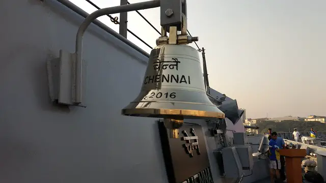 INS Chennai is packed with contemporary and sophisticated ‘state of the art’ weapons and sensors such as Surface to Surface Missile and Surface to Air Missiles. The ship is fitted with a modern Surveillance Radar which provides target data to the gunnery weapon systems of the ship. The ship’s Anti Submarine Warfare capabilities are provided by the indigenously developed Rocket Launchers and Torpedo Launchers. The ship is equipped to fight under Nuclear, Biological and Chemical (NBC) warfare conditions. A unique feature of this ship is the high level of indigenisation incorporated in the production, accentuating our national objective of ‘Make in India’. Some of the major indigenised equipment / system onboard INS Chennai include Combat Management System, Rocket Launcher, Torpedo Tube Launcher, Automated Power Management System, Foldable Hangar Doors, Helo Traversing system, Auxiliary Control System and the Bow mounted SONAR. Named after the iconic port city of Chennai, the ship has a complement of about 45 officers and 395 personnel. Enhancement of crew comfort has been a significant feature of INS Chennai, which has been ensured through ergonomically designed accommodation based on ‘modular’ concepts. The ship will be under the command of Captain CR Praveen Nair, a Communication & Electronic Warfare specialist. With the changing power dynamics in the Indian Ocean Region, INS Chennai will augment the Indian Navy’s mobility, reach and flexibility whilst proudly flying the Indian flag. |