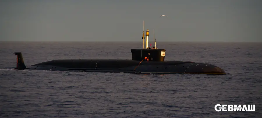 Project 955 Borey-class SSBN with its various masts extended. Sevmash picture |