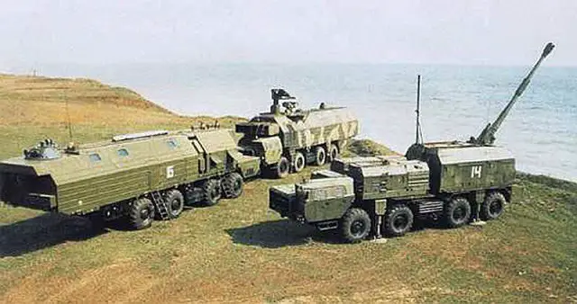 The Bereg self-propelled coastal defense artillery system is designed to fight small and medium ships travelling at a speed of 100 knots. It has a target acquisition range of 35 km and an effective range of 22 km. The 130-mm self-propelled gun has a speed of 60 km/h, a rate of fire standing at 72 rd./min. and an endurance of 850 km. Each element of the Bereg system weighs from 43 tons to 44 tons.