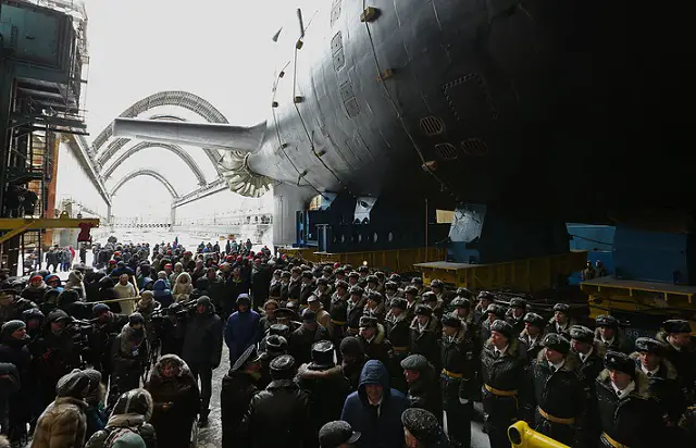 Shipyard Director Mikhail Bunichenko gave the order to float the submarine from the building slip after which submarine Commander, Captain First Rank Alexander Beketov broke a traditional bottle of champagne against the shipboard. The event was attended by Russian Deputy Prime Minister Dmitry Rogozin and Navy Commander-in-Chief Admiral Vladimir Korolev.
