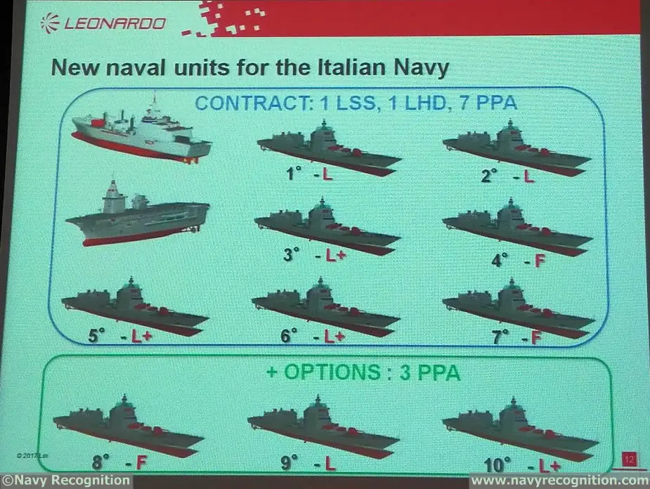 As part of the 2014-2015 Italian Naval Law (Legge Navale), the Italian Navy will take delivery of 1 LHD amphibious vessel, 1 LSS logistics support vessel and 7 PPA (2x Light, 3x Light + and 2x Full) plus an option for 3 more PPA (1 in each configuration).