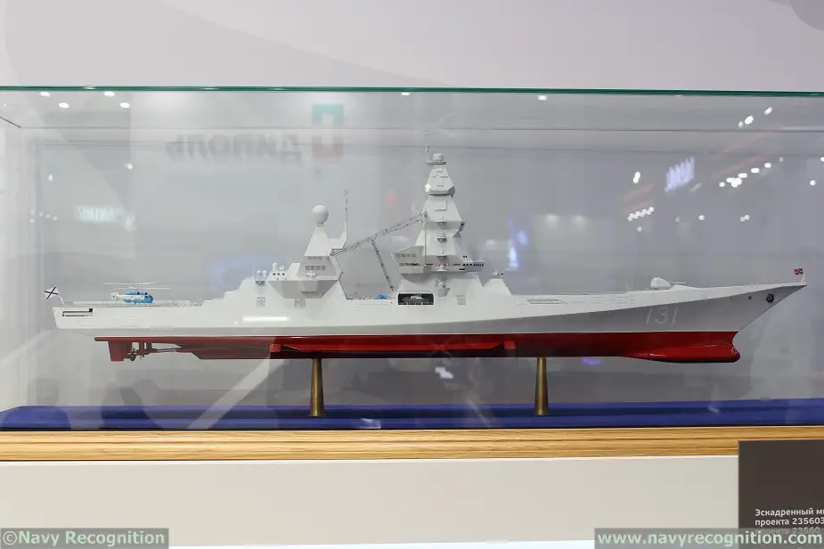 Scale model showing the Project 23560E "Shkval-class" Destroyer (export variant of Leader-class) at Army 2016 exhibition. Twelve ships of the 10,000t "Leader class" are planned to enter service from 2023-25, split between the Northern and Pacific Fleets. They will all be nuclear powered. They will be fitted with the ABM-capable S-500 SAM and Kalibr (SS-N-27) cruise missile.