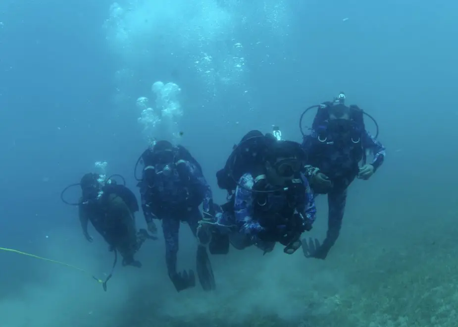 A sailor deployed to U.S. 5th Fleet's Task Group 52.3, left, and Egyptian Naval Force (ENF) sailors conduct a familiarization dive during Eagle Response 18. Eagle Response 18 is an explosive ordnance disposal and diving exercise with the ENF conducted to enhance interoperability and war-fighting readiness, fortify military-to-military relationships and advance operational capabilities of all participating units. (U.S. Navy photo/Released)