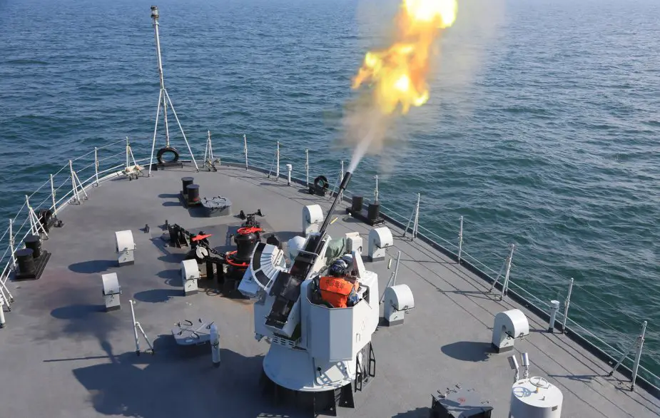 The minesweeper Yucheng (Hull 846) attached to a minesweeper squadron with the North China Sea Fleet of the PLA Navy fires it's 30mm gun during a realistic training exercise in the waters of the Yellow Sea in 2017 (Picture source: China military)