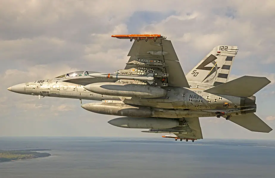 An F/A-18 flies with an Advanced Anti-Radiation Guided Missile – Extended Range (AARGM-ER) during a captive carry flight test at Patuxent River Air Station in Maryland. The Navy is integrating AARGM-ER on the F/A-18E/F and EA-18G, and will be compatible for integration of the F-35 (Picture source: US Navy)