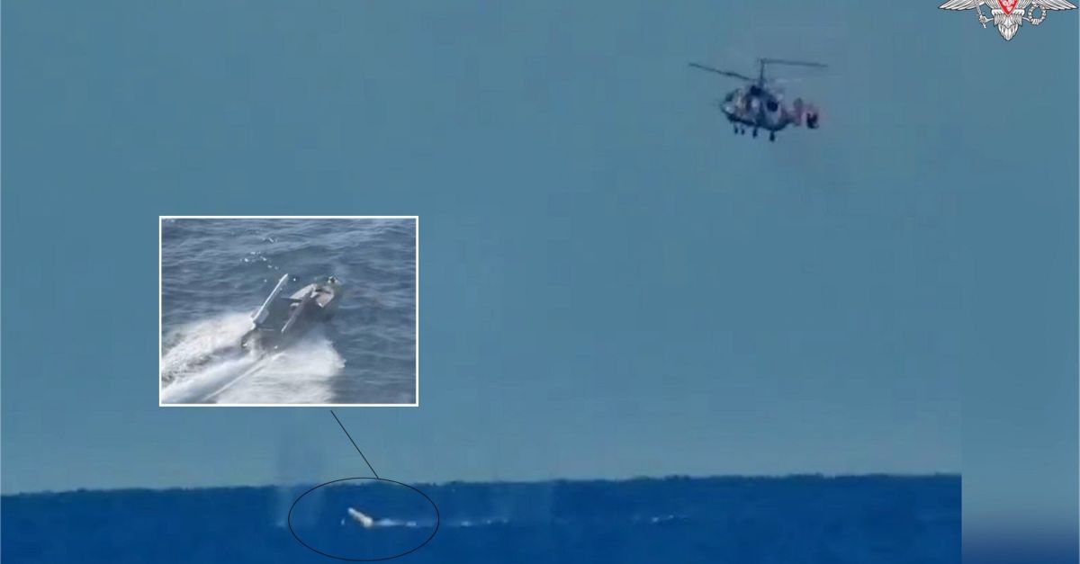 The footage depicts a Russian Armed Forces helicopter pursuing a Ukrainian unmanned boat. The naval drone was equipped with two air-to-air missiles guided by thermal targeting. However, this new tactic was not successful, as the drone failed to hit the Russian helicopter.
